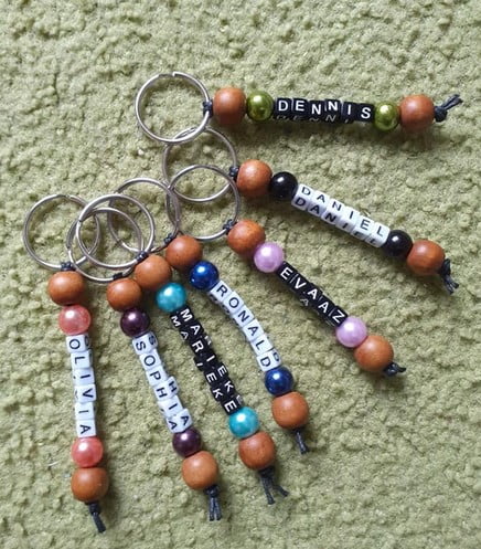 Eenvoudige, maar leuke sleutelhanger met naam, gemaakt van kralen. De sleutelhanger is een leuk en persoonlijk cadeautje voor een traktatie of jezelf. De sleutelhanger bestaat uit 2 houten kralen, 2 gekleurde kralen en de letterkralen.